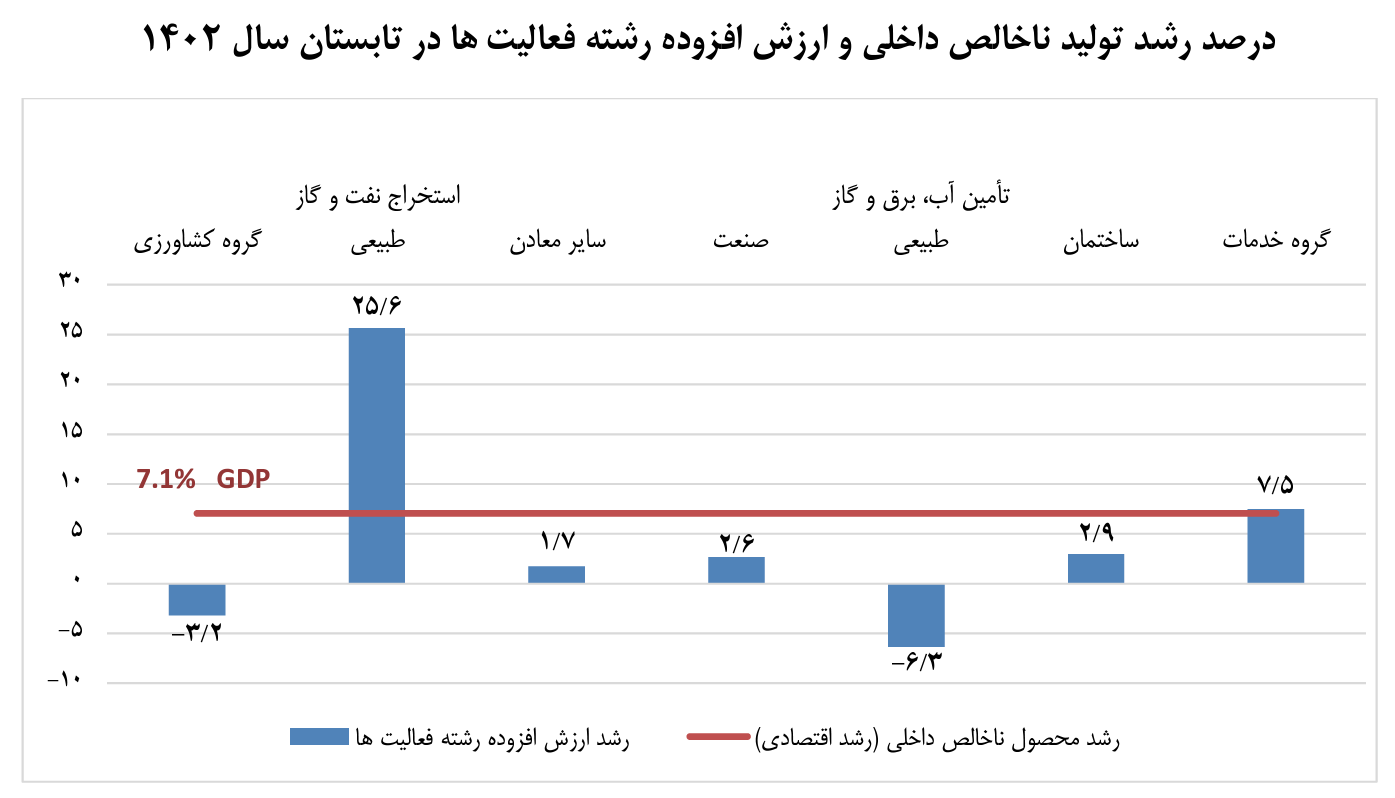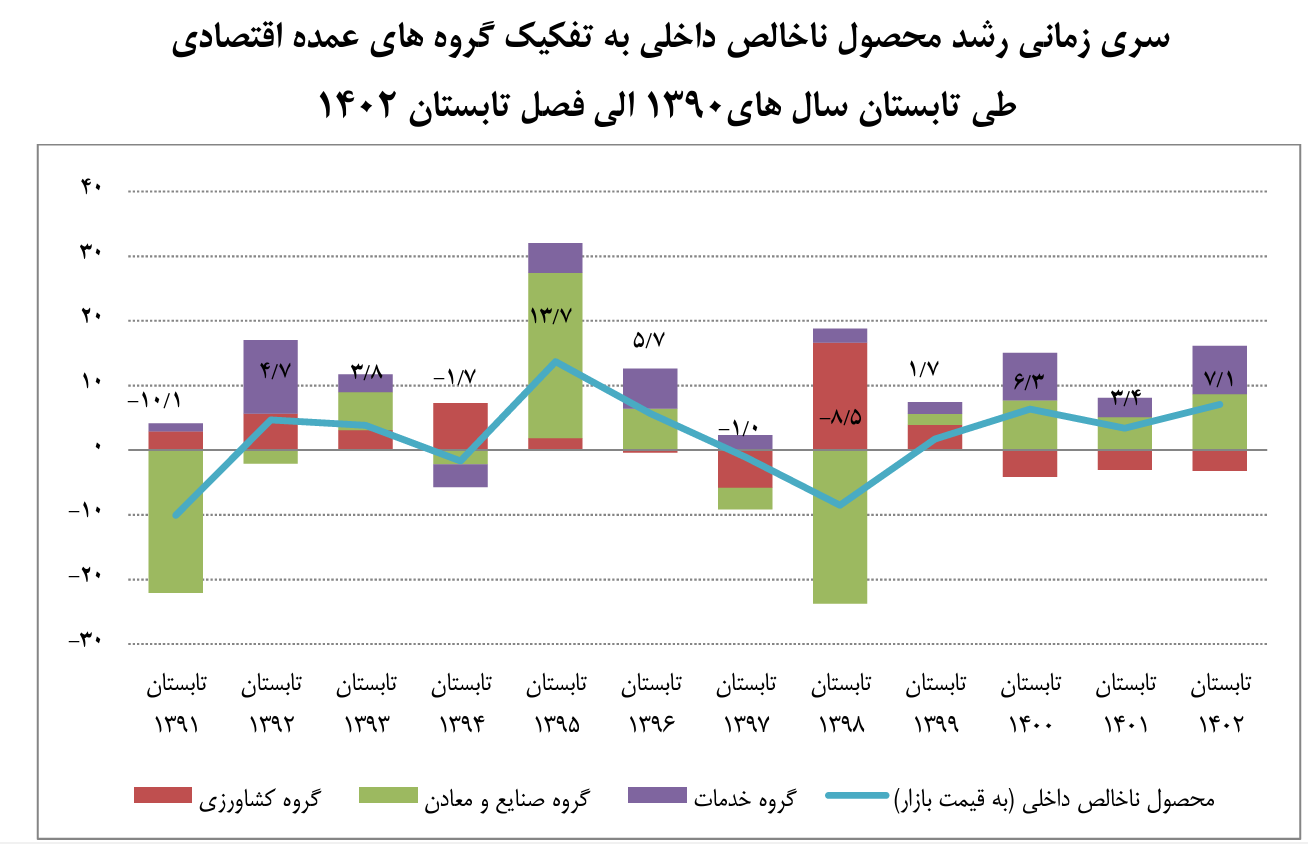 نتایج مذکور حاکی از آن است که در تابستان سال ١٤٠٢، رشته فعالیتهای گروه کشاورزی رشد منفی ۳.۲، گروه صنایع و معادن ٨.٧ درصد (شامل: استخراج نفت خام و گازطبیعی ٢٥.٦، سایر معادن ١.٧، صنعت ٢.٦، انرژی منفی ۶.۳ و ساختمان ٢.٩ درصد) و گروه خدمات ٧.٥ درصد نسبت به تابستان سال ١٤٠١، رشد داشته است.