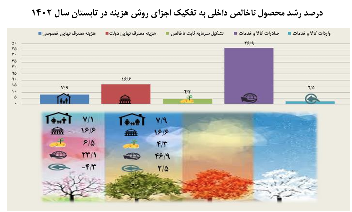 در حالی که رقم مذکور در مدت مشابه سال قبل با نفت ۲۰۴ هزار میلیارد تومان و بدون نفت ۱۷۷ هزار میلیارد تومان بوده که نشان از رشد ٧,١ درصدی محصول ناخالص داخلی با نفت و ٤.٢ درصدی محصول ناخالص داخلی بدون نفت در تابستان سال ١٤٠٢ دارد.