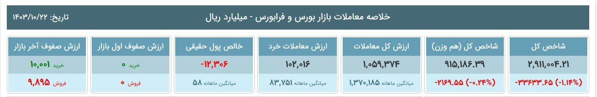 به گزارش چابک آنلاین به نقل از ایرنا، شاخص کل بورس در پایان معاملات امروز - شنبه ۲۲ دی ماه - ۳۳ هزار و ۶۳۲ واحد منفی شد و در رقم ۲ میلیون و ۹۱۱ هزار واحد قرار گرفت و از دستیابی به جایگاه ۳ میلیون واحدی بازماند. شاخص هموزن نیز ۲۱۶۹ واحد نزولی شد و به ۹۱۵ هزارو ۹۸۶ واحد برگشت.