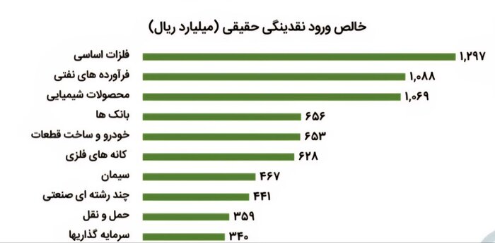 در معاملات امروز ۵۶۷ نماد مثبت و ۱۴۰ نماد منفی شدند، همچنین ۱۲۹.۴ میلیارد تومان نقدینگی حقیقی وارد گروه فلزات اساسی، ۱۰۸.۸ میلیارد تومان وارد فرآورده نفتی و ۱۰۶.۴ میلیارد تومان وارد گروه شیمیایی شد. بیشترین ورود پول حقیقی به نماد فولاد با ۶۷.۱ میلیارد تومان، شبندر با ۴۶.۲ میلیارد تومان و وبملت با ۳۳.۸ میلیارد تومان اتفاق افتاد.